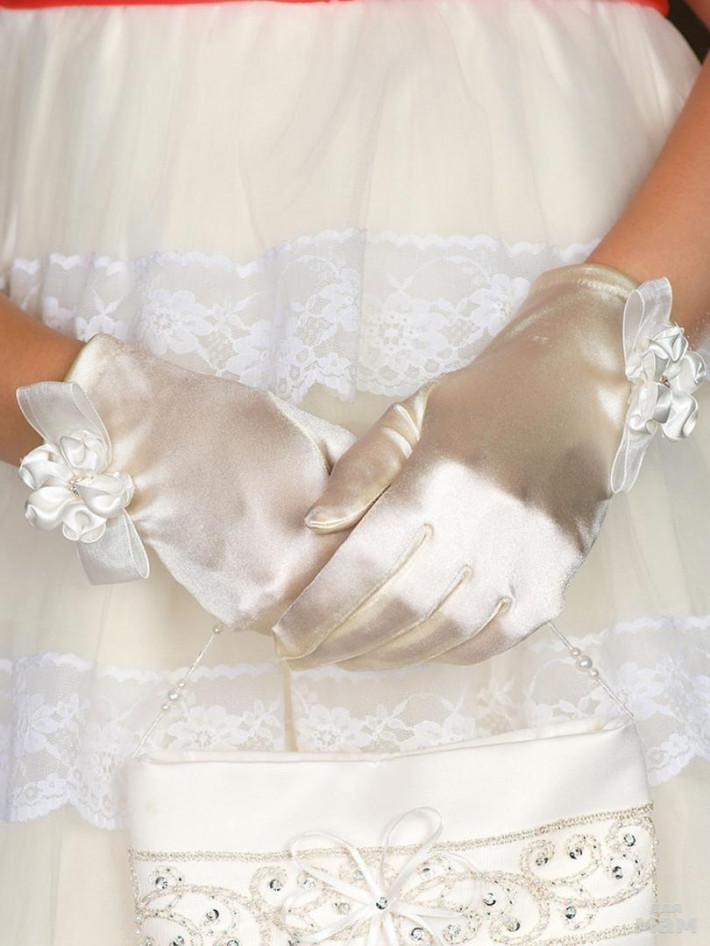 Модель украшена бантом из органзы и оригинальным цветком, дополненным стразом в обрамлении жемчужин.