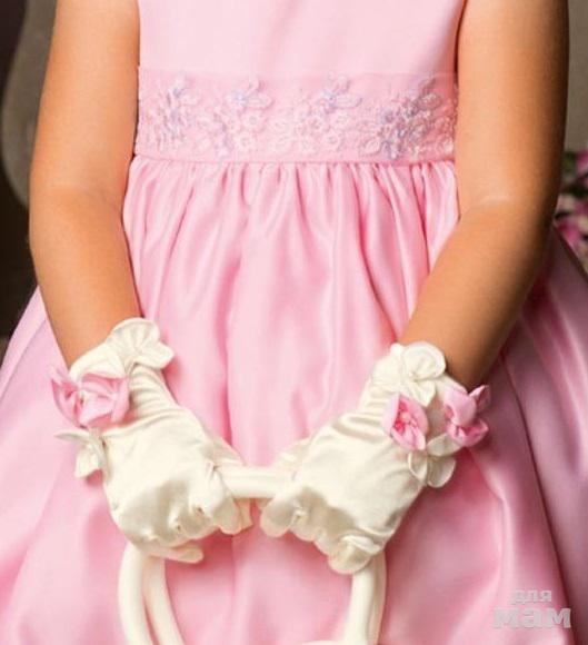 Элегантные перчатки для девочек. Модель украшена изящными цветами двух оттенков с жемчужными серединками.