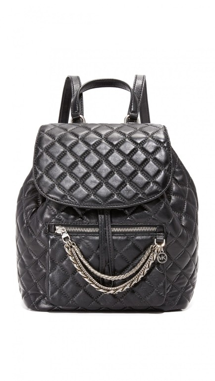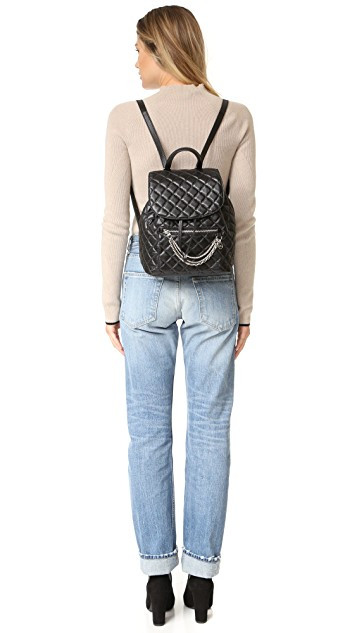 Стильный рюкзак MICHAEL Michael Kors из высококачественной стеганой кожи. Передний карман на молнии украшен цепочками. Верхний клапан на магнитной застежке закрывает линию с завязками. Внутреннее отделение на подкладке с логотипами оснащено пятью карманами. Петля для подвешивания и регулируемые лямки.