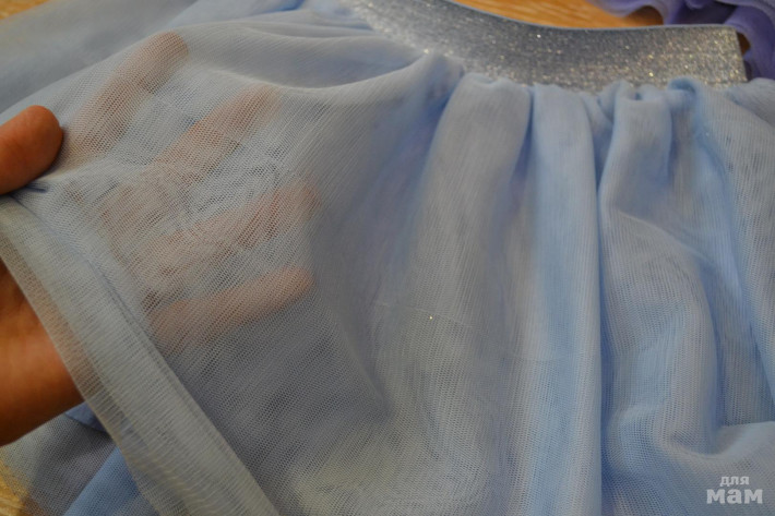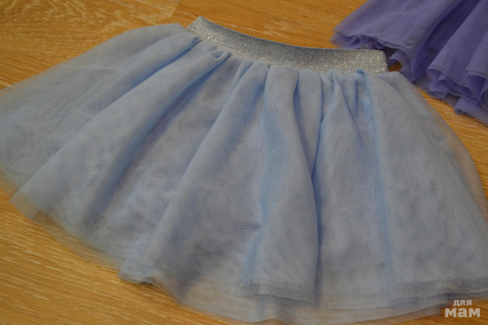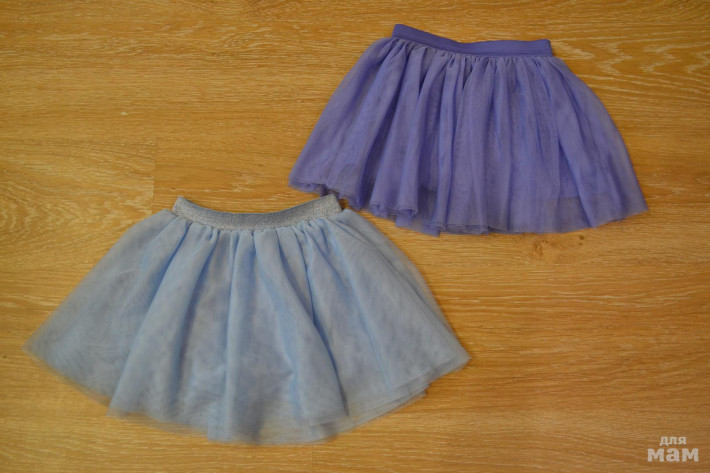 Юбочки из мягкого фатина в два слоя + мягкая трикотажная подкладка внутри у обеих. Размер 116, но обе маломерки, на этот рост только с лосинами носить. А так, они от 104см. примерно подойдут. Голубая юбочка очень нежного цвета, прямо новогодняя)) с легкими серебристыми блесточками на поясе. У сиреневой тоже талия на резиночке. Состояние хорошее, дочка носила их в садике. На фатине есть полосочки, типа зацепок, но если растянуть материал руками, они пропадают. Но они есть - предупреждаю.