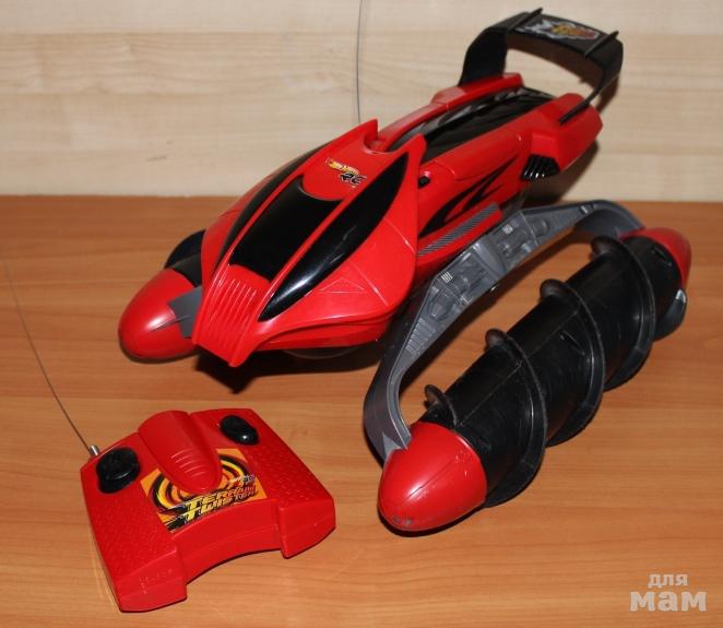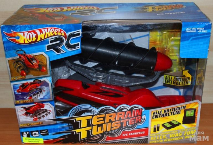 Вездеход Hot Wheels RC Terrain Twister - это автомобиль на дистанционном управлении, который двигается по любой поверхности. Благодаря поворотливым понтонам и уникальным штопорам протекторов, этот автомобиль невозможно остановить, он крутится на любой поверхности. Управляющее устройство имеет две кнопки, с помощью которых транспортное средство перемещается вперед, назад и из стороны в сторону.