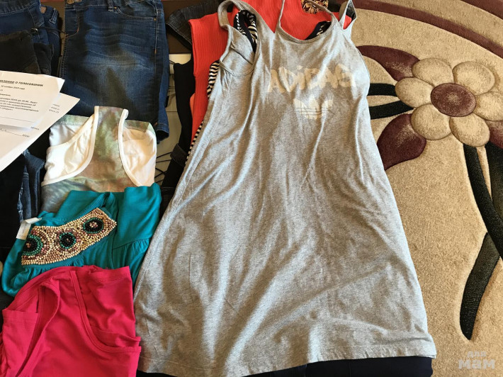 в пакет входит: брюки 5 штук( одни из них новые с этикеткой); юбки 2 штуки; платья 8 штук, одно из них новое с этикеткой.+1 штука в подарок( для дома); футболки туники 5 штук,