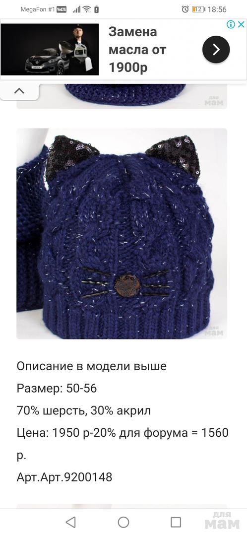 Состоит из шапочки и удобного снуда. Впереди имитация носика и усиков кошки, сверху ушки, выполненные из черных пайеток.
