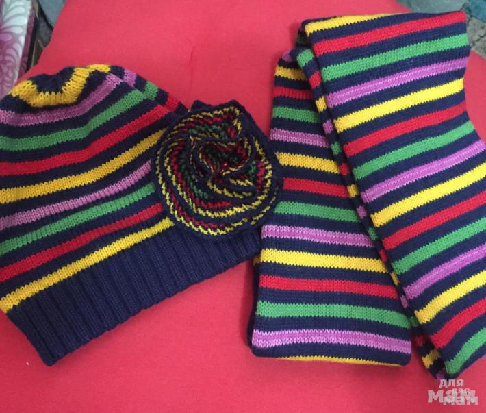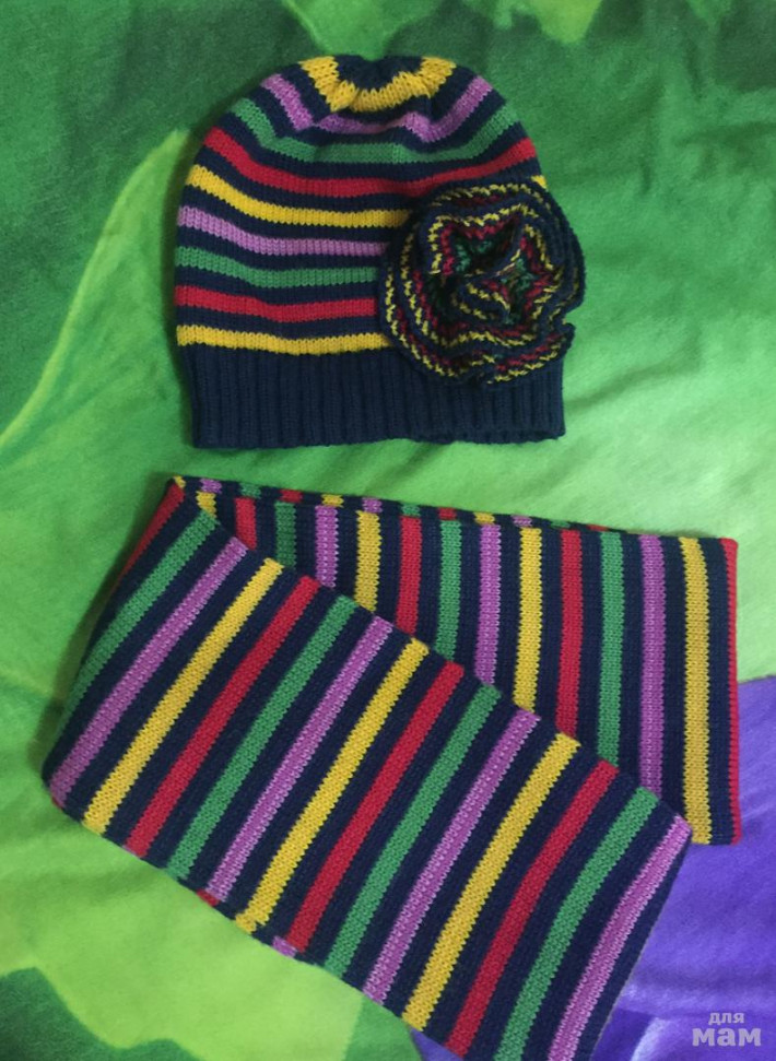 Пристрою комплект( шапочка и шарфик) в идеале р 52-53 см. Края шарфика сшила руками- получился снуд в два оборота, если нужен шарф- можно спокойно убрать нитку.