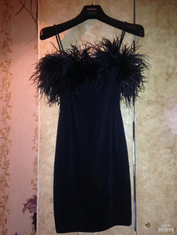 Платье черное с перьевой опушкой,покупала в США,на мой рост 170 чуть выше колен,на размер 44-46,ближе к 46.Тянется хорошо,однако в 1 раз,после химчистилось.Можно подъехать посмотреть и померить.