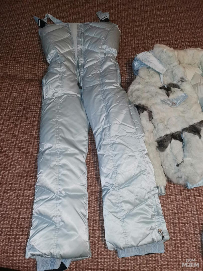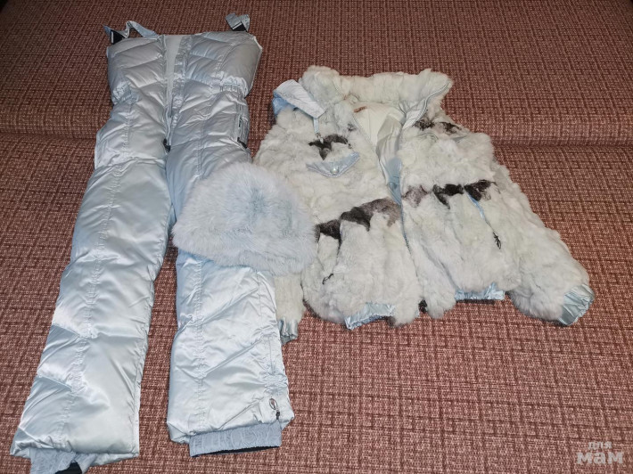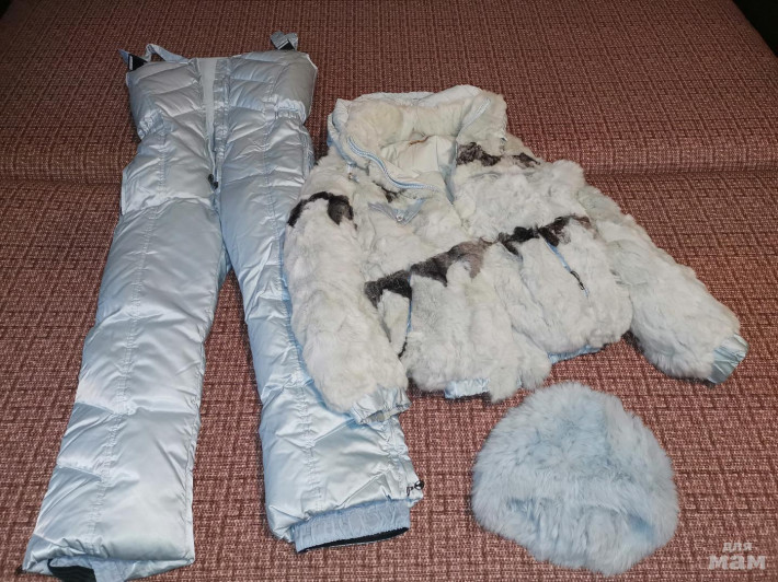 Комплект б/у, брючки в отличном состоянии, шубка ношена более активно, не хватает одного камушка на кармашке и кое где мех уже имеет желтоватый оттенок.