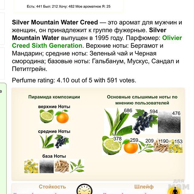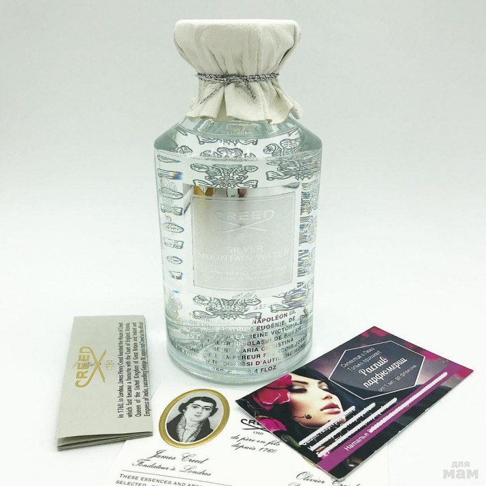 Silver Mountain Water Creed — это аромат для мужчин и женщин, он принадлежит к группе фужерные. Silver Mountain Water выпущен в 1995 году. Парфюмер: Olivier Creed Sixth Generation. Верхние ноты: Бергамот и Мандарин; средние ноты: Зеленый чай и Черная смородина; базовые ноты: Гальбанум, Мускус, Сандал и Петитгрейн.
