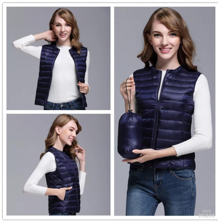 На размер 44-46, невесомая, внутри пух, теплая, идеально одеть под пальто или шубку. Складывается в маленький мешочек, цвет как на картинке.