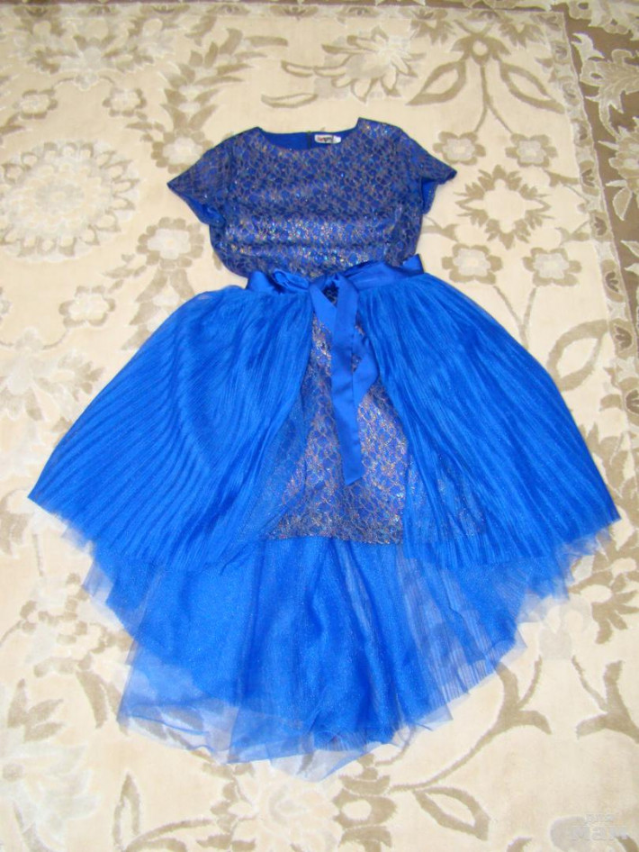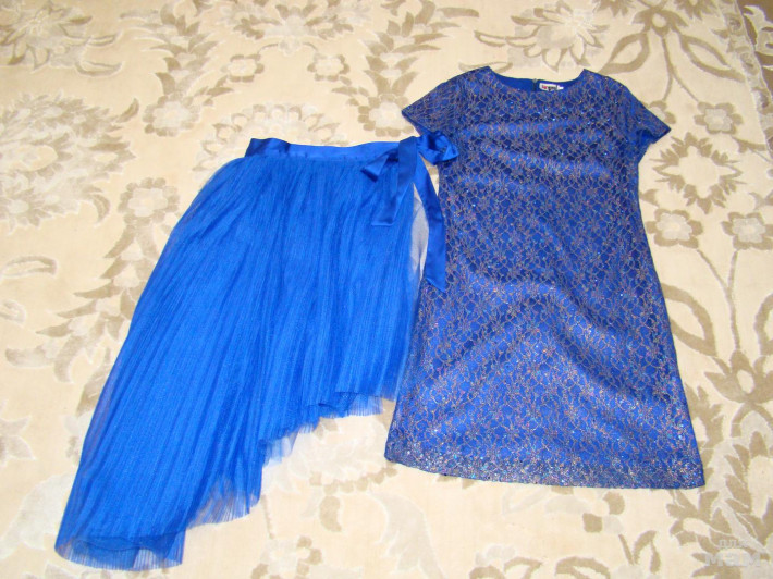 Продам очень красивое платье и юбку- пачку синего цвета .Платье с паетками,подклад хлопок. Юбочка -верхний слой плиссе,завязывается на ленточку.Отлично на новый год и потом на любой праздник можно одеть отдельно.Платье 152р , юбка 158р.Цена 3500р.Отправлю почтой.