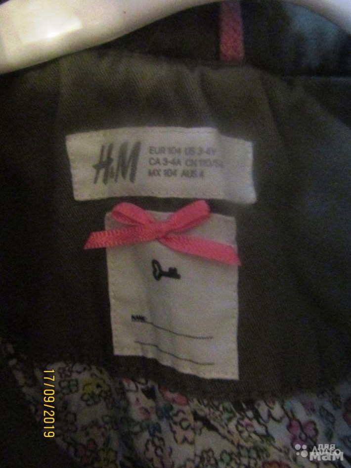 Продам б\у хлопковую парку H&M размер 104,сезон весна - прохладное лето. Состояние хорошее, носили мало. Размер указан 104, но маломерит немного, лучше 98-104 ( от 3 до 4 лет). Цвет хаки, не яркий, не маркий. Фасон приталенный, лучше на худенькую девочку. Без утеплителя, с капюшоном, карманы на липучках.Замеры: длина по спинке 52 см, спереди 48 см, спинка чуть длиннее. Рукав от плеча 37 см, ширина от подмышки до подмышки 37 см.