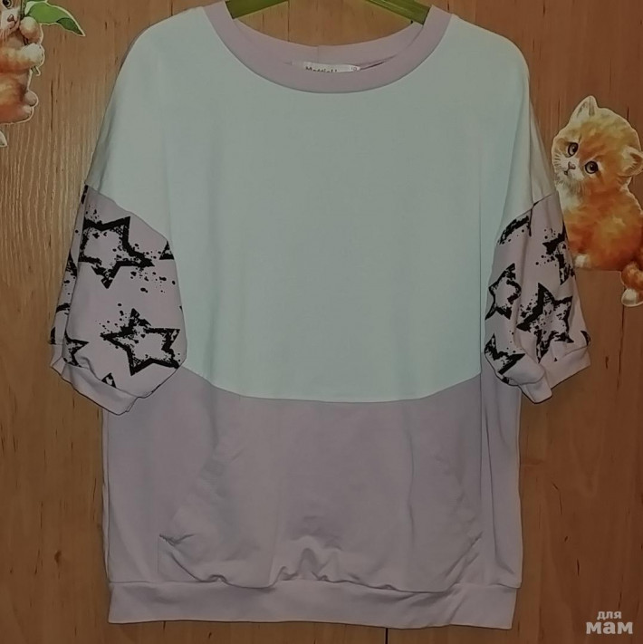 Джемпер с коротким рукавом из мягкого трикотажа футер. Верхняя часть полочки и рукава выполнены из ткани компаньона. Спереди удобный карман-кенгуру.В идеальном состоянии)