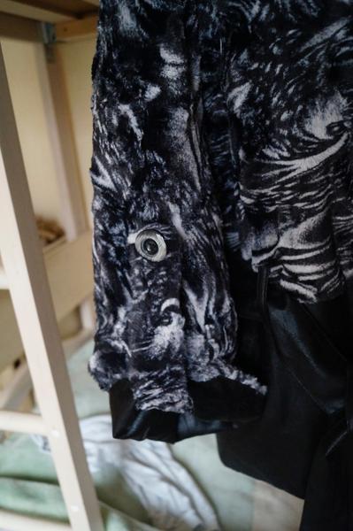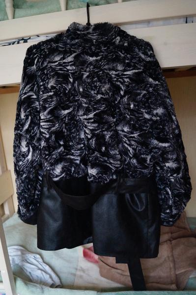 Куртка из искусственного меха и кожи с поясом и карманами,на подкладке , утеплена - на синтепоне, рукав - трансформер, делается трехчетветрным, воротник стойка. Длина рукава: 57 см.Длина изделия: 74 см. Ширина 65 см.