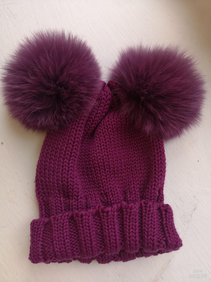 Одинарная вязка,100% шерсть, помпоны из натурального меха.
