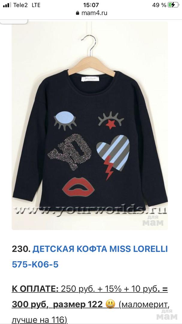 К ОПЛАТЕ: 300 руб. + 15% + 10 руб. = 355 руб., размер 122 😃