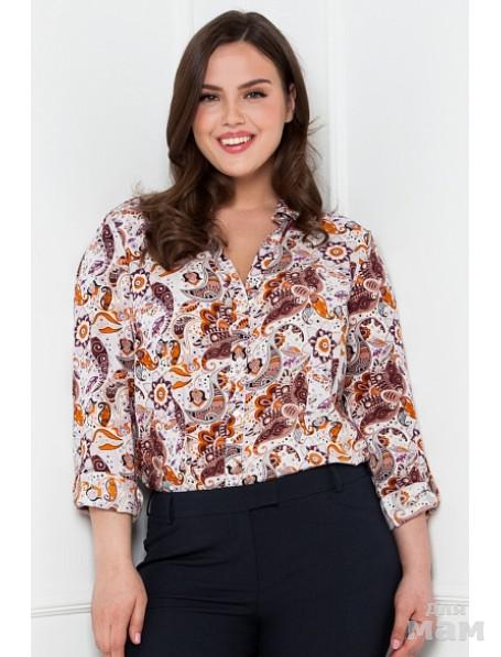 Стильная блузка свободного силуэта со сплошным принтом "пейсли". Модель с втачными рукавами и рубашечным воротником выполнена из вискозной ткани, застёгивается на петли и пуговицы. Трендовый принт выполнен в свежих цветах кедровой древесины и пряной горчицы.