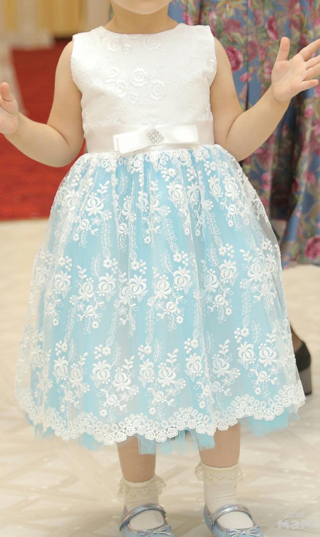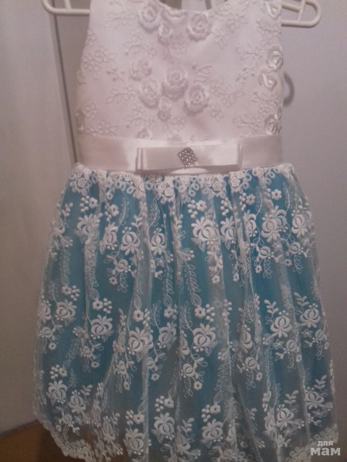 Платье очень красивое нежное,очень освежает ребенка.Одевали один раз на праздник.Размер от 104 до 112.на худеньких на 116 тоже подойдет.