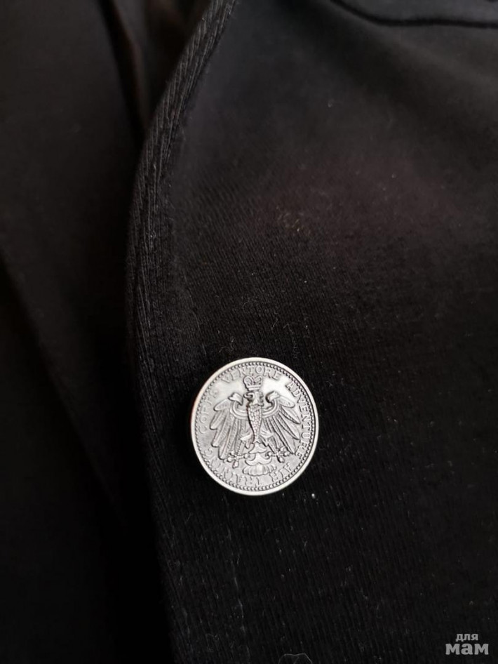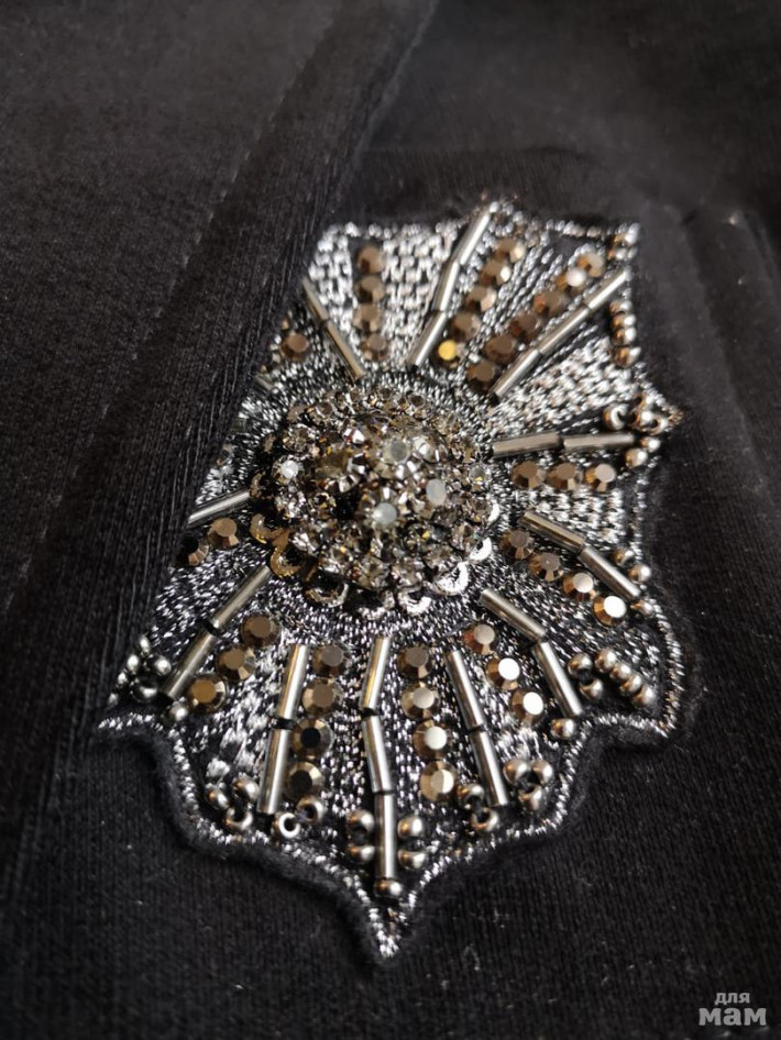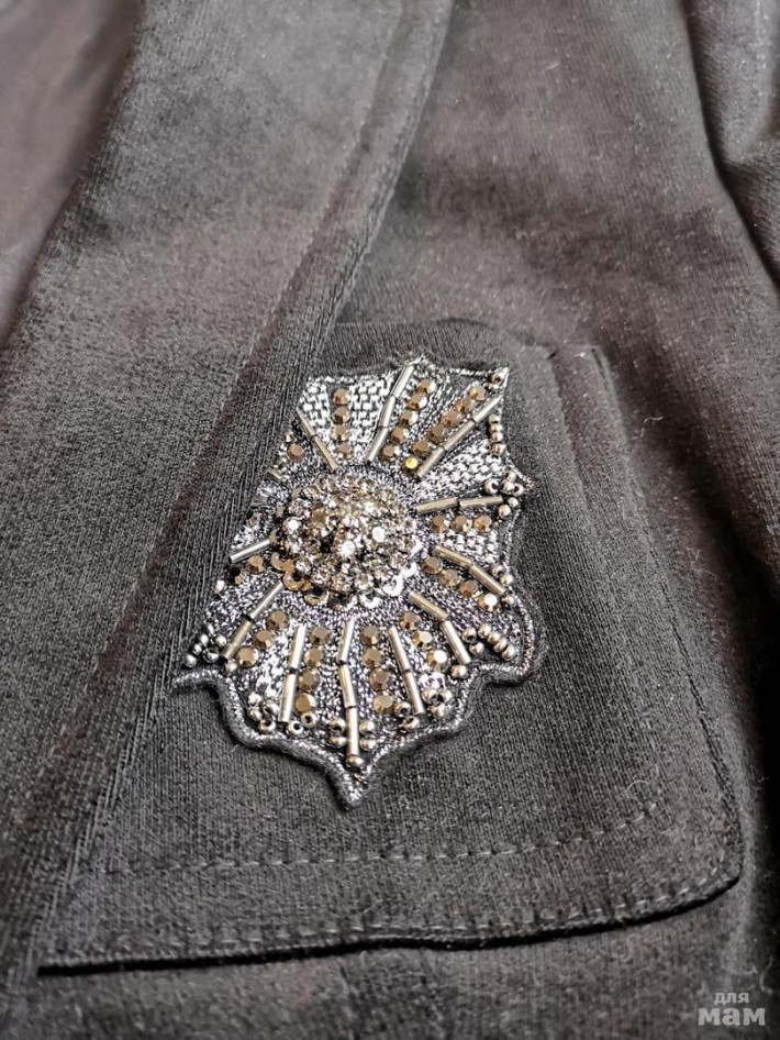 Добротный, ткань бархатистая, очень красивые пуговицы и вышивка-брошь. Держит форму. Пуговка на талии.