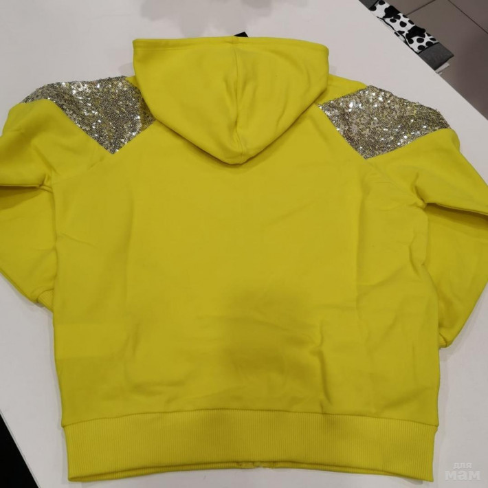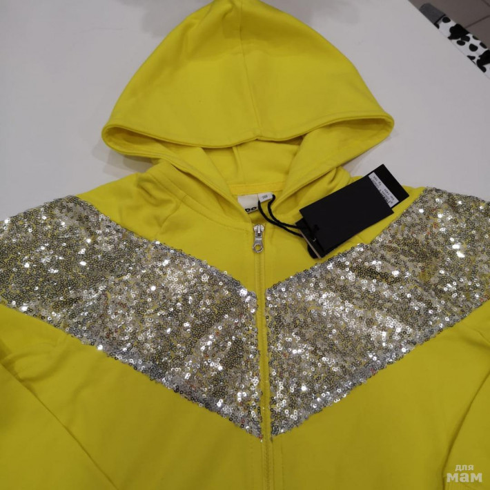 Худи ИДО, с паетками, яркого цвета спелого лимона, размер 10 лет, 14 лет. Сочетается с черными брюками, серыми. Цена 2750 рублей.