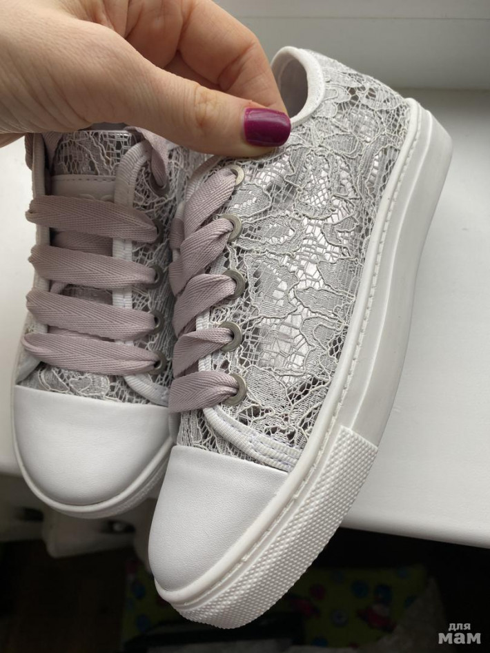 Новые, качественные и нереально красивые кеды итальянского бренда Jog Dog. Оформлены под кружево, под ним очень красивый лилово-серебристый отлив. На солнышке блестят! Шнурки тканевые. Цвет очень универсальный, но не такой маркий как белый. Подойдут подо всё - и под платья, и под брюки. Стелька 19,5см. Коробка есть. Стоили очень дорого, поэтому торга нет.