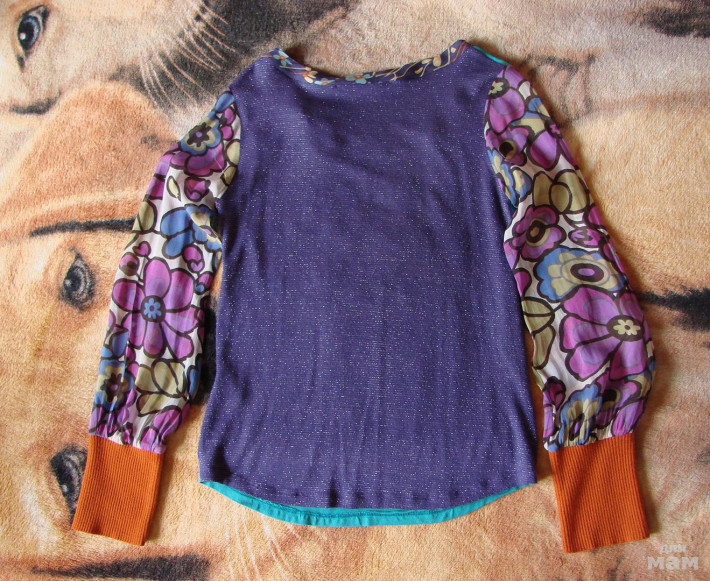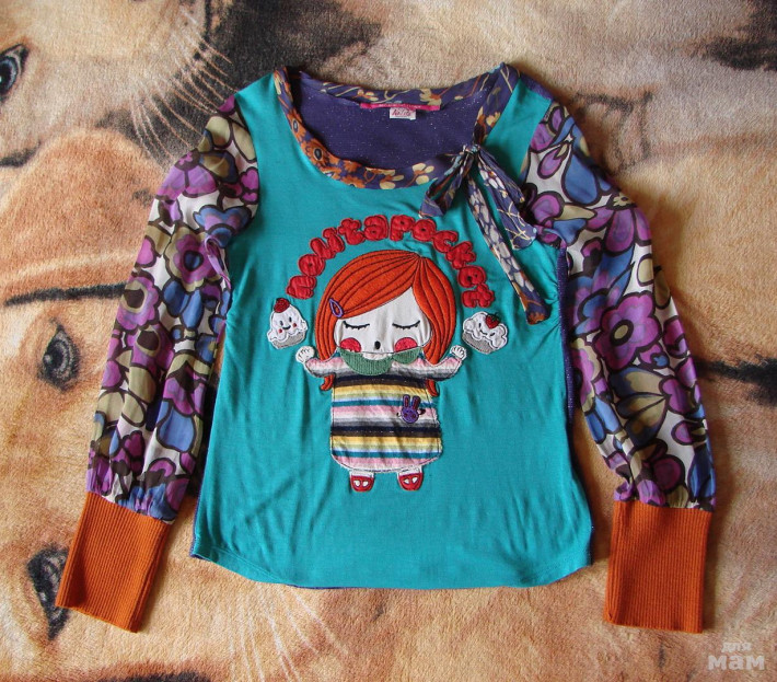 Впереди тканевая шитая аппликация, полупрозрачные рукава из мягкого шелка с хлопком цветочной расцветки, манжеты трикотажные, спинка с меттализированной нитью, вырез украшен бантом.
