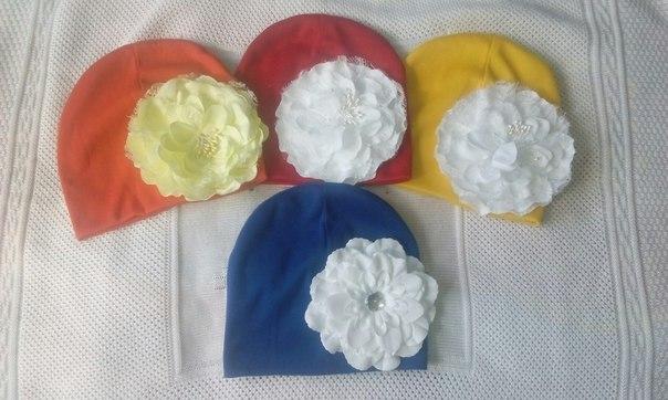 Милые шапочки с цветочками дополнят образ вашей девочки!Качество хлопка хорошее,отлично тянется,так что шапочки подойдут крохам с 6 мес и красавицам 4-х лет.А еще есть шапочки для новорожденных,отлично подойдут на выписку или фотосессию.