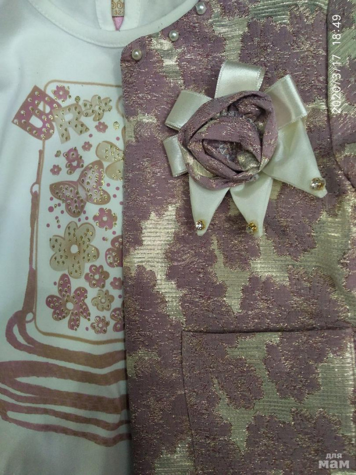 Новая нарядная 3-ка для девочки.Кофточка с длинным рукавом,хлопок. Брючки на утяжке и молнии. Жакет парча. Брошь отстёгивается. Размеры 2 года и 5 лет. Турция.