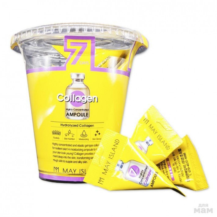 Ампула для упругости кожи May Island 7 Days Highly Concentrated Collagen содержит высокую концентрацию коллагена и способствует восстановлению эластичности кожи.