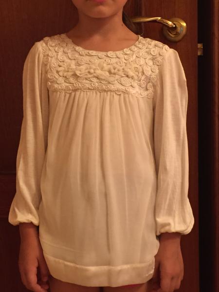 Чудесная туника Впереди шелк, рукава трикотаж. Очень большемерит. На фото рост 121 см состояние новой- долго была велика, а потом выросли- не носили, только меряли.