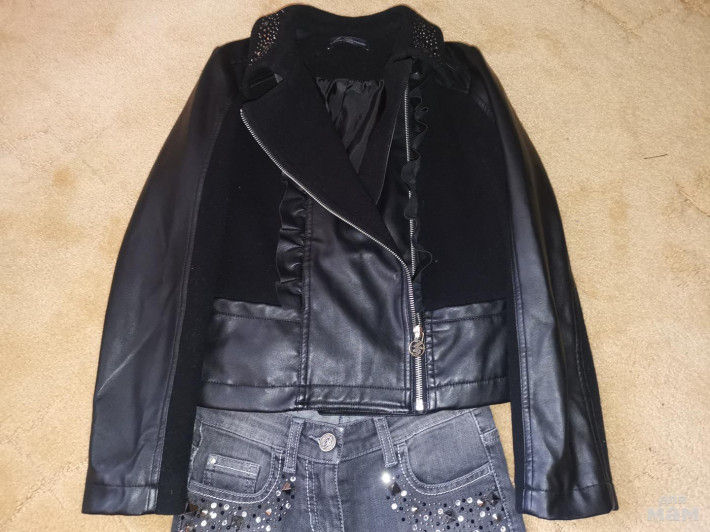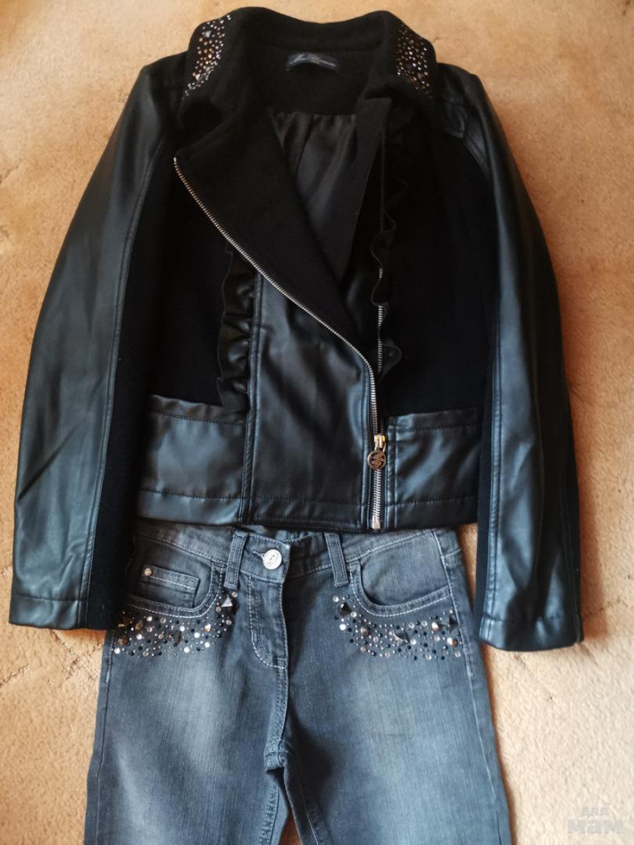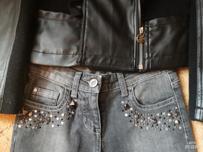 Джинсы: р.10 покупала как новые, бирок нет, мы так и не одевали, только мерели..., цвет графит, с камнями! ( Талия 30см, шаговый 65см, утяжки нет!!! ) Нам на рост 134см уже шикарно сидят!!!