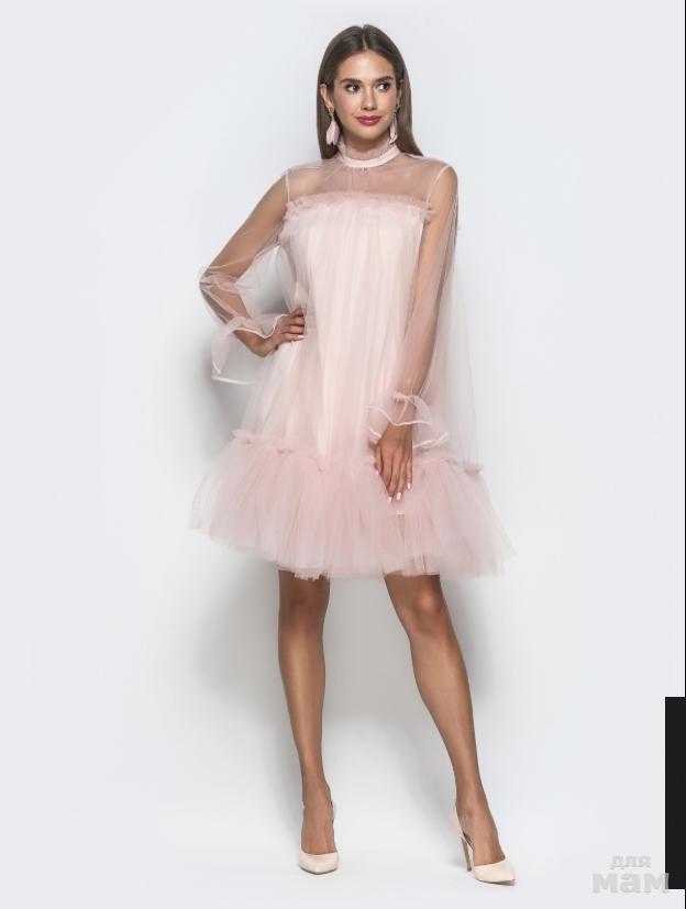 Коктейльное платье-трапеция из воздушного фатина. Воротник-стойка застегивается на пуговицу сзади. Идеально для обладательниц фигуры "груша", "песочные часы" и "прямоугольник". Замеры изделия : длина по спинке - 99 см; длина рукава (от плечевого шва) - 63 см. Размер 44, 3000руб.