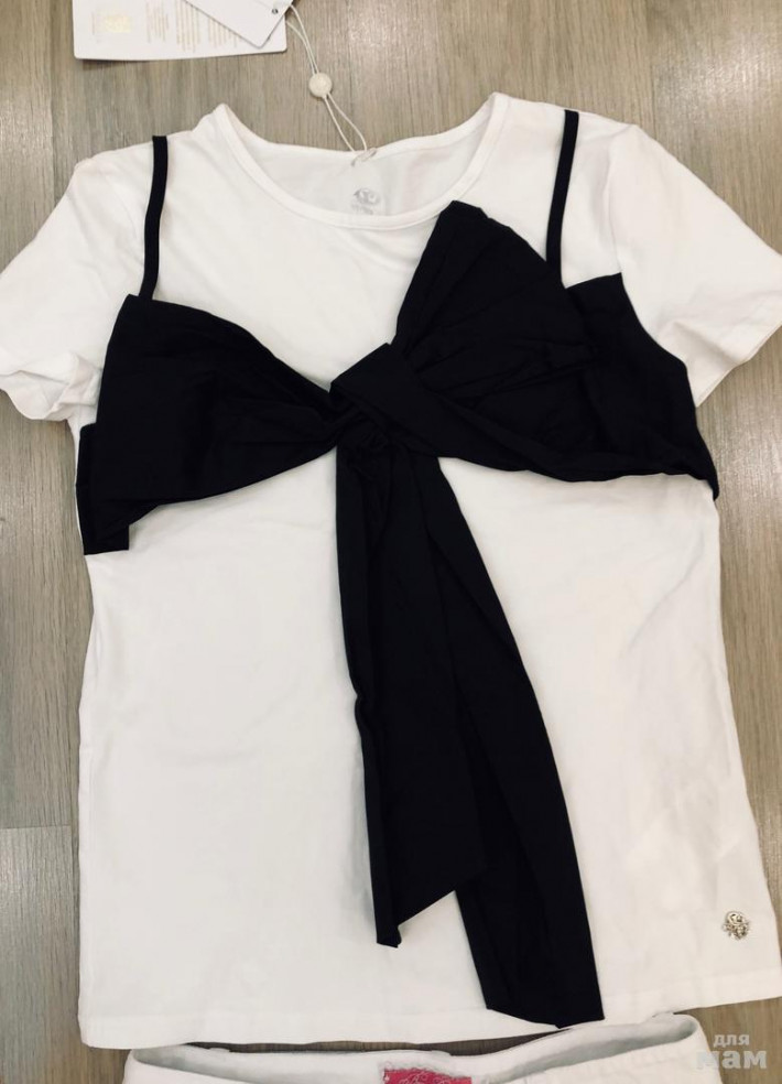 Новая белая футболка Stefania сверху с черным топом-бантом, очень стильная, р.158, подойдет на 146-158 в зависимости от комплекции. ПРОДАНО