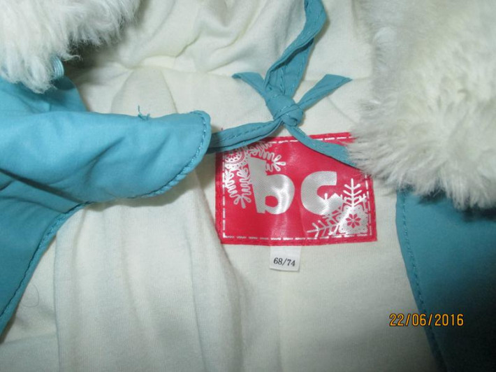 Очень теплый конверт - комбинезон, наполнитель пух 90% / перо 10%по маркировке 68/74, мы носили до 1,5 летв комплекте варежки, валеночки, мех отстегивается