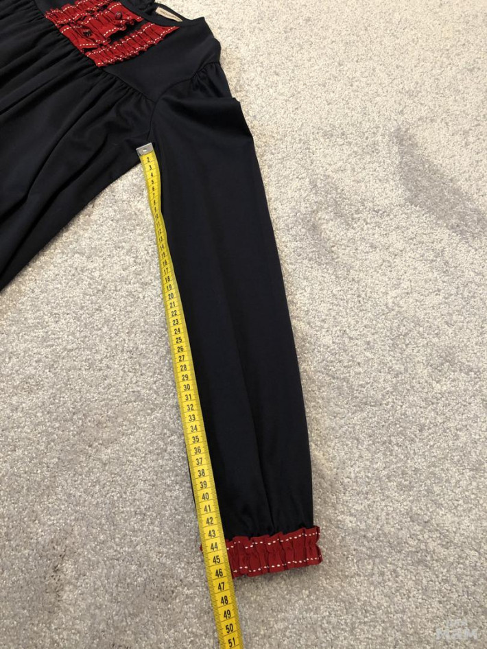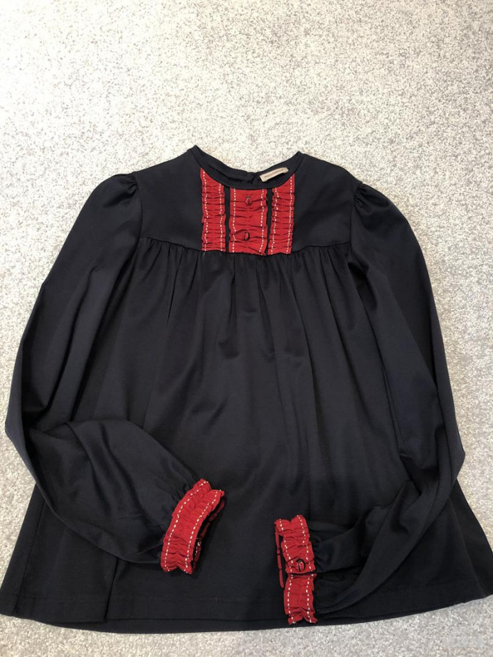 Блуза темно-синего цвета.Была куплена исключительно для школы.Но дочка надела ее от силы 3 раза.Состояние новой вещи.Блуза свободная,для ношения на выпуск..Размер 11-12 лет.