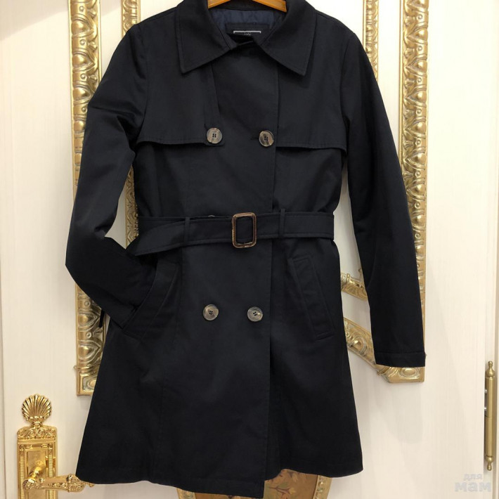 Темно-синий двубортный тренч из непромокаемого хлопкового твила подружится с любыми вещами. Легкий однотонный плащ с широкими кокетками, врезными карманами и отложным воротником дополнен поясом с пряжкой . Изнутри на теплой простеганной подкладке!Отлично подойдет на весну/осень.Состояние идеальное.Носили мало очень( один сезон,раз 5)до школы и обратно.Размер 11 лет(140-146 рост).Базовая коллекция из года в год.В Цуме всегда есть в продаже!