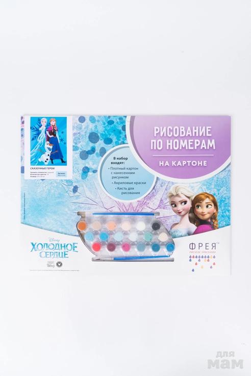 Набор для раскрашивания по номерам по мотивам мультфильма «Холодное сердце». В набор входит: плотный картон с нанесенным рисунком, акриловые краски в баночках, кисть для рисования. Готовая работа может отличаться от изображения на упаковке.