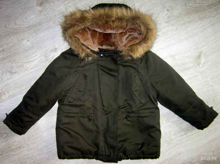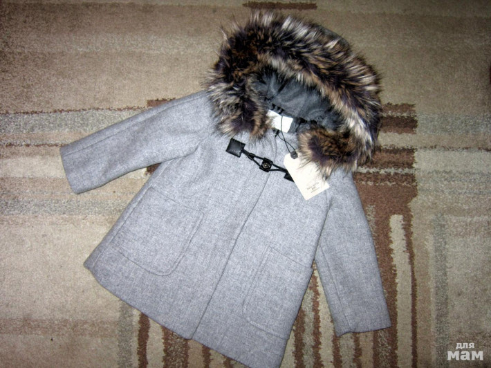 ZARA 5/110 светло-серого цвета, утеплено синтепоном, с шикарной отделкой из искусственного меха и двумя накладными карманами. Застегивается на молнию и застежку-петлю. Состав: