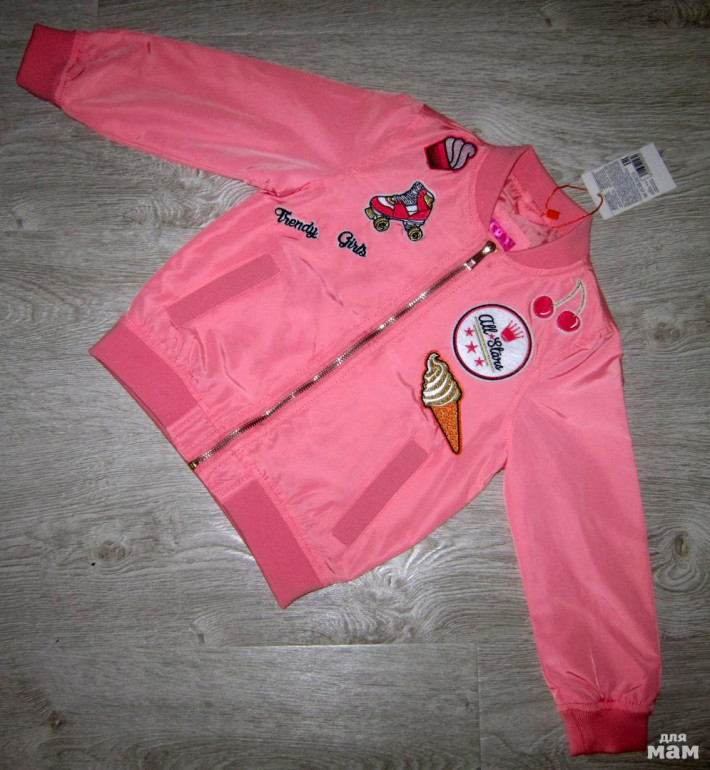 Легкая ветровочка-бомбер на лето MAX&JASSI р.4/5 (104-110). Цвет светло-коралловый, трикотажные резиночки на горловине, рукавах и по низу. Красивые аппликации. Внутри подклад из полиэстера. Смотрится шикарно.