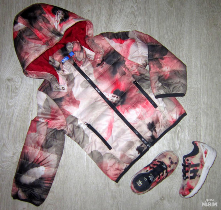 НОВАЯ клевая и очень красивая легкая стеганая курточка ADIDAS ОРИГИНАЛ р. 4-5 лет (110 см). Очень необычный дизайн - цветы. Наполнитель: синтепон. Тоненькая, на холодное лето, теплую осень-весну. Воротник-стойка, застежка-молния, прорезные карманы на молнии, капюшон отстегивается, прилегающие манжеты на рукавах и нижняя часть. На груди прорезиненный логотип-трилистник Адидас.