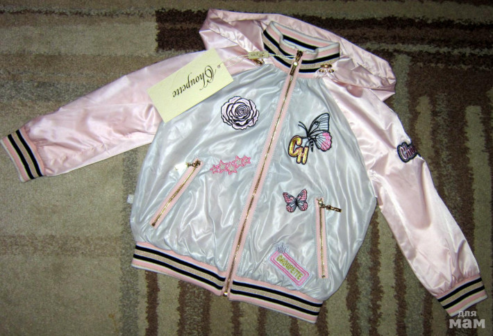 Реально крутая ветровка-бомбер CHOUPETTE (Франция) р.110 (маломерит на 98-104). Жемчужно-серого и розового цветов, украшена объемными бабочками и другими интересными вышивками. Сочетание перламутрового блеска с матовым верхней ткани и декора с золотой нитью на трикотажных элемкнтах делают эту модель стильной и гламурной. Мягкая подкладка из натурального хлопка, застегивается эта ветровка, как и два вместительных кармана, на «молнию», капюшон, защищающий от непогоды, можно при желании затянуть.