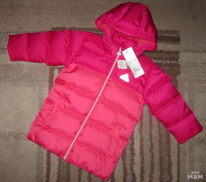 Пуховик зимний ADIDAS ОРИГИНАЛ р.2-3 (98-106). Наполнитель: 70% утиный пух / 30% перо. Моделька удлиненная, прикрывает попу. Очень красивый яркий цвет - верх малиновый, низ коралловый. Ткань не жесткая, очень мягкая и комфортная, с блеском, внутри хлопковый подклад. Низ рукавов и низ пуховичка на внутренней широкой резиночке (баллон), внутри рукавов снегозащитные манжеты. Капюшон отстегивается, на кнопках. Застежка-молния. Температурный режим 0 -25 (4 снежинки), водоотталкивающий (3 капельки).
