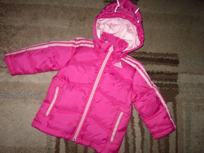 Модный, стильный, яркий пуховик ADIDAS ОРИГИНАЛ р. 92, но большемерит. Лучше на 98-104. Ярко-розового цвета. Горлышко закрыто, воротничок внутри флисовый, на рукавах дополнительные снегозащитные манжеты. Состояние отличное.
