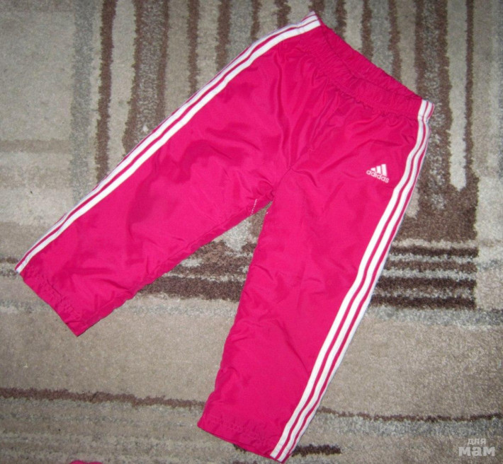 Утепленные брючки ADIDAS ОРИГИНАЛ р. 3А-98 см (до 104), ярко-розового цвета с белыми ломпасами. Верхняя ткань плащевка, подклад полиэстер, утеплены тоненьким слоем синтепона. Сезон осень-весна. Спереди вышит логотип адидас, снизу снегозащитные манжеты. В идеале.
