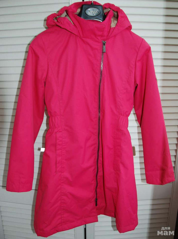Слегка утеплён чем-то. Под дождём не промокает!!! ткань с пропиткой- капли стекают с неё. Застегивается на одну молнию, два глубоких кармана и очень удобные капюшон- чётко по голове садится.