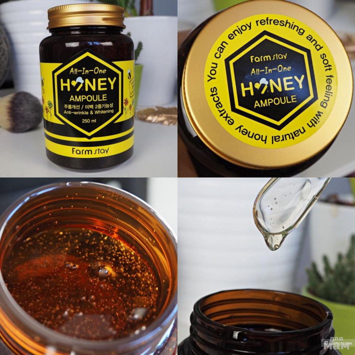 Ампульная сыворотка с медом представляет собой натуральный жидкий экстракт 3 в 1: содержит экстракты меда, пчелиного маточного молочка и прополиса. Соединения витамина В, как В1, В2, В6 и пантотеновой кислоты и т.д., дают мощный увлажняющий эффект, предотвращают сухость и помогают управлять увлажнением кожи. Кроме того, он омолаживает кожу изнутри, т.к. эти элементы стимулируют внутреннее кровообращение.