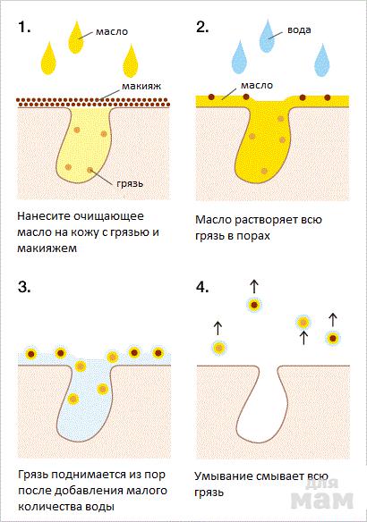 Нанести нужное количество очищающего масла на сухие руки и аккуратно помассировать лицо на сухой коже, чтобы растворить макияж. Сделать эмульсию, добавив воду (масло станет молочным), затем тщательно промыть теплой водой.