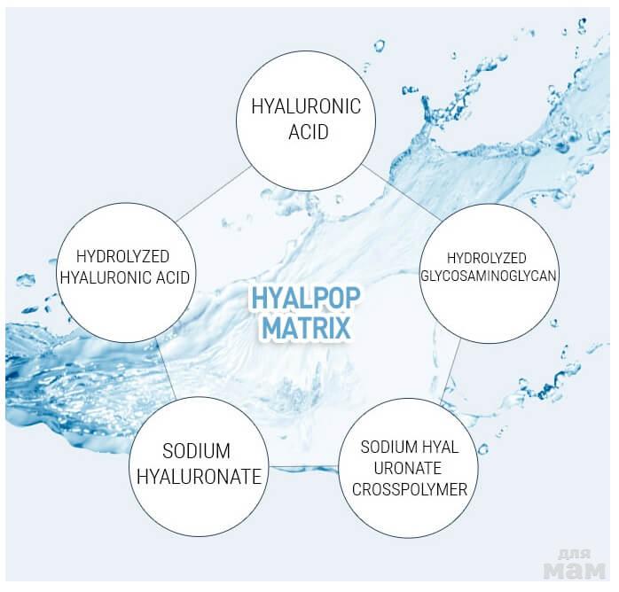 Комплекс HYALPOP MATRIX - включает в себя 5 видов гиалуроновой кислоты. Этот комплекс интенсивно и глубоко питает клетки эпидермиса влагой, восстанавливает гидролипидный барьер кожи. Препятствует дегидратации, повышает эластичность кожи и замедляет процессы старения. Способствует поддержанию нормального уровня влаги в клетках и тканях кожи.