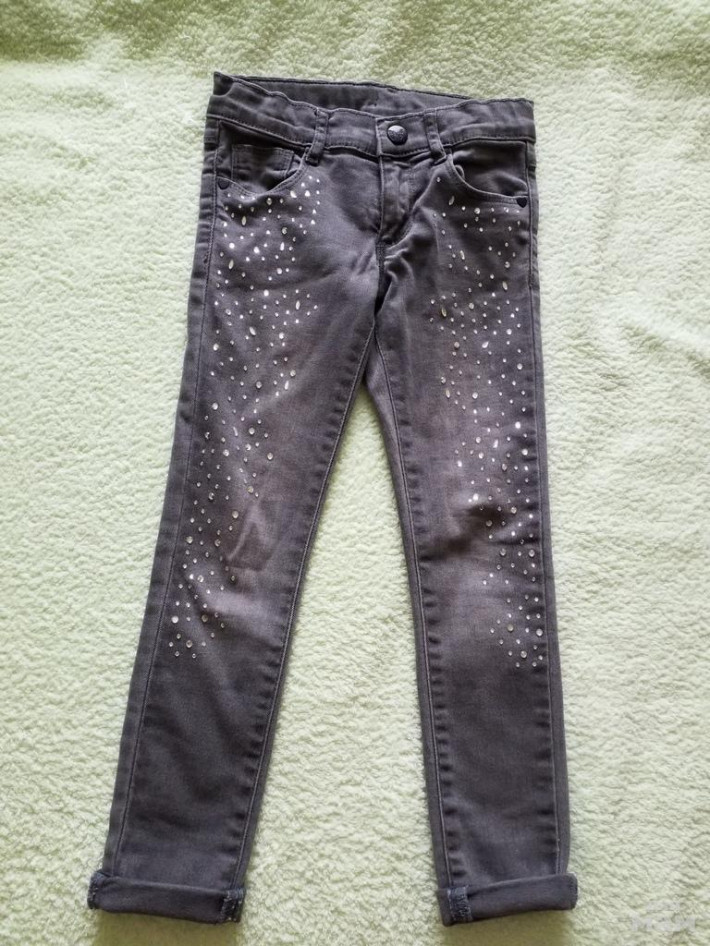 Джинсы со стразами Mothercareразмер 6 лет до 116см. Но носить можно с 5 лет, т.к. модель задумана с подворотом. Узкие по ножке, на худенькую девочку, на поясе утяжка. Смотрятся очень эффектно! Цвет серый с потертостями. Застегиваются на кнопочку и молнию, 5 карманов. Б/у, состояние отличное. Замеры: шаговый шов без подворота 52 см, талия 59 см без утяжки. Покупала за 2049 р.