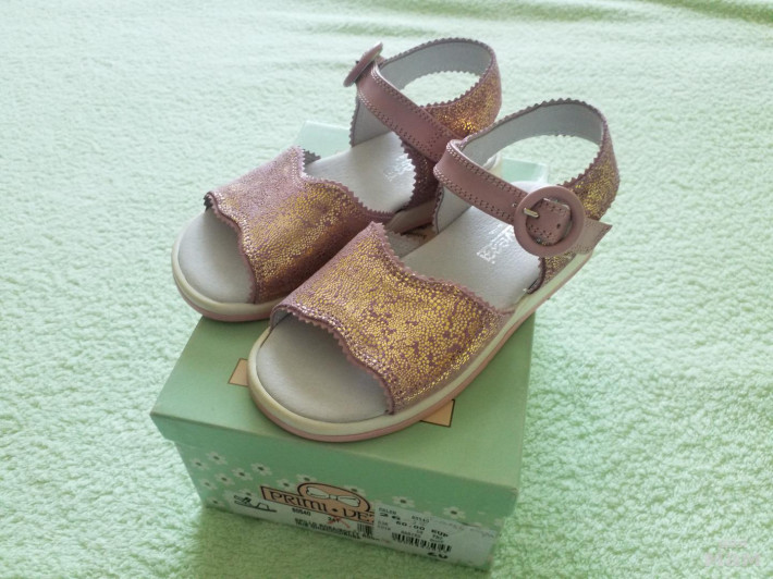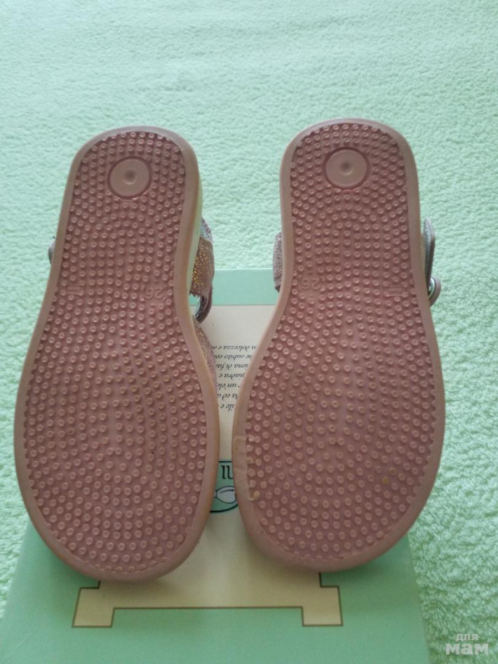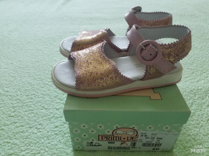 Новые босоножки р.26 фррма Primivezzi Италия. Натуральная замша, кожаная стелька 17,5 см. От края до края 18,5 см. Покупала в Италии за 60€. Но мы их переросли. Цвет розовый с золотым напылением, по краям резные вставочки. Шикарные! Этой фирмы в Москве не встречала. Коробка в наличии.