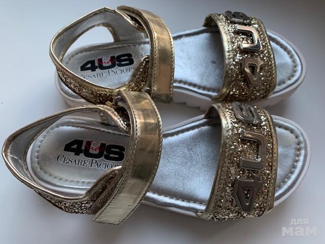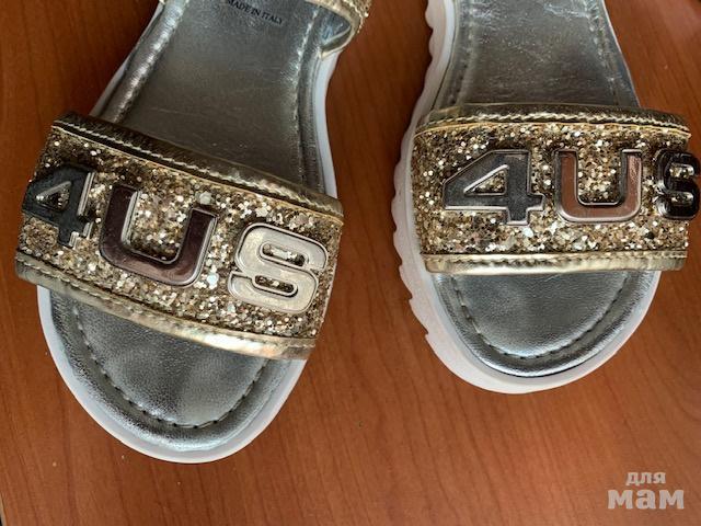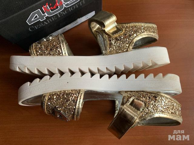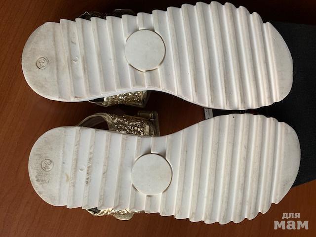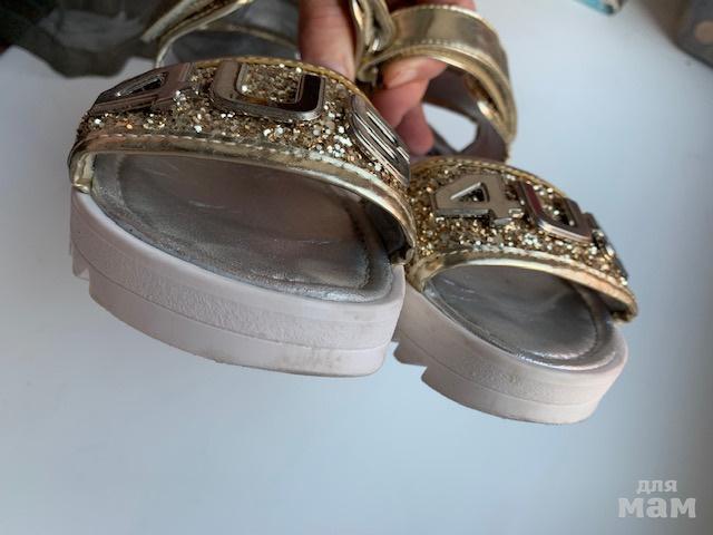 Золотистые глиттерные босоножки, размер 34Пр-во Италия.Очень классные, на солнце сверкают.Носили не часто, следу носки на подошве и немного на стельке (на фото всё отражено)