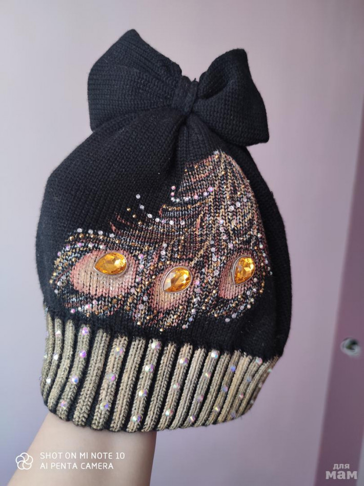 Классная шапка от Карины. Состояние идеальное, все стразы на месте, как новая. Очень теплая, носили с золотым киви.